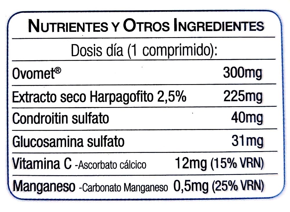 Ovomet, Harpagofito, Chondroitin Glucosamine, Vitamin C and Manganese.