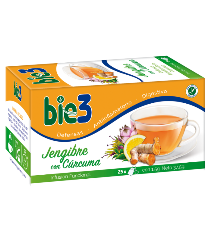 Bie3 Jengibre con Cúrcuma actúa reforzando el sistema inmune frente a gripes y catarros, promoviendo una digestión saludable y actuando como calmante natural, gracias a sus propiedades antiinflamatorias y antioxidantes.